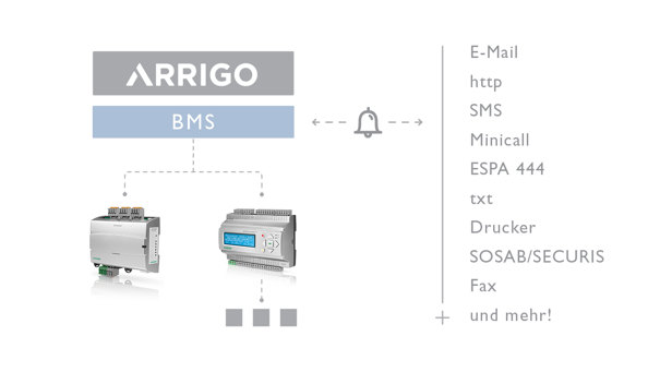 Arrigo ist Ihr System-Hub, in dem Daten aus verschiedenen Quellen zusammengestellt werden. Über Modbus, BACnet, M-Bus und OPC ist Arrigo mit den Reglern und Feldgeräten des Systems verbunden und kann somit unmittelbar einen Alarm ausgeben.
