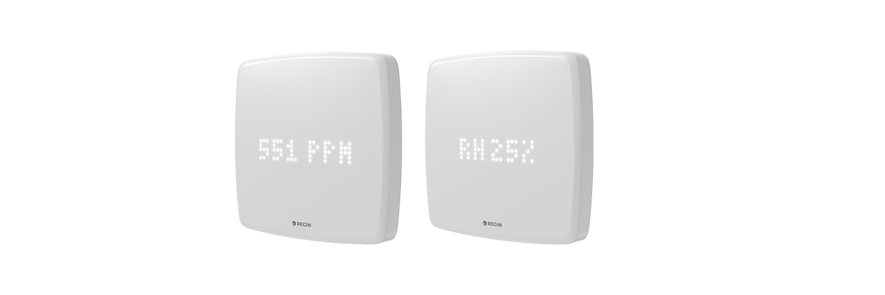 Regio RTX is available in 15 white variants, with and without display, and with or without communication via BACnet, Modbus, and EXOline. The models come with different combinations of built-in sensors for temperature, humidity, CO₂, VOC (Volatile Organic Compounds), and PIR (motion detection). Versions with a CO₂ sensor also include a traffic light function that clearly indicates current CO₂ levels.