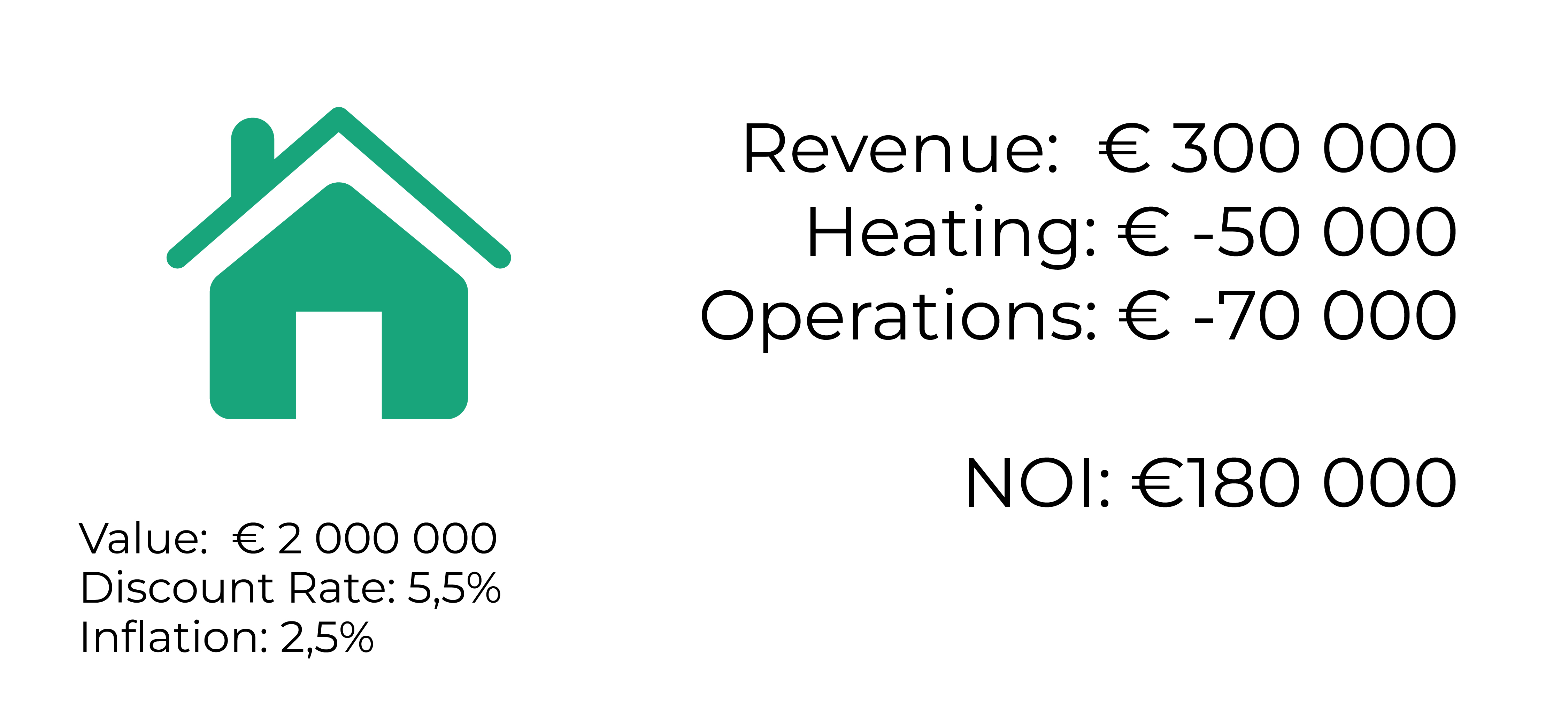 Prenons l'exemple d'une propriété d'une valeur de 2 millions d'euros, d'un taux d'actualisation de 5,5 % et d'un taux d'inflation de 2,5 %. La propriété a un revenu locatif annuel de 300 000 euros, des coûts de chauffage de 50 000 euros et d'autres coûts d'exploitation de 70 000 euros, ce qui donne un RNE de 180 000 euros.