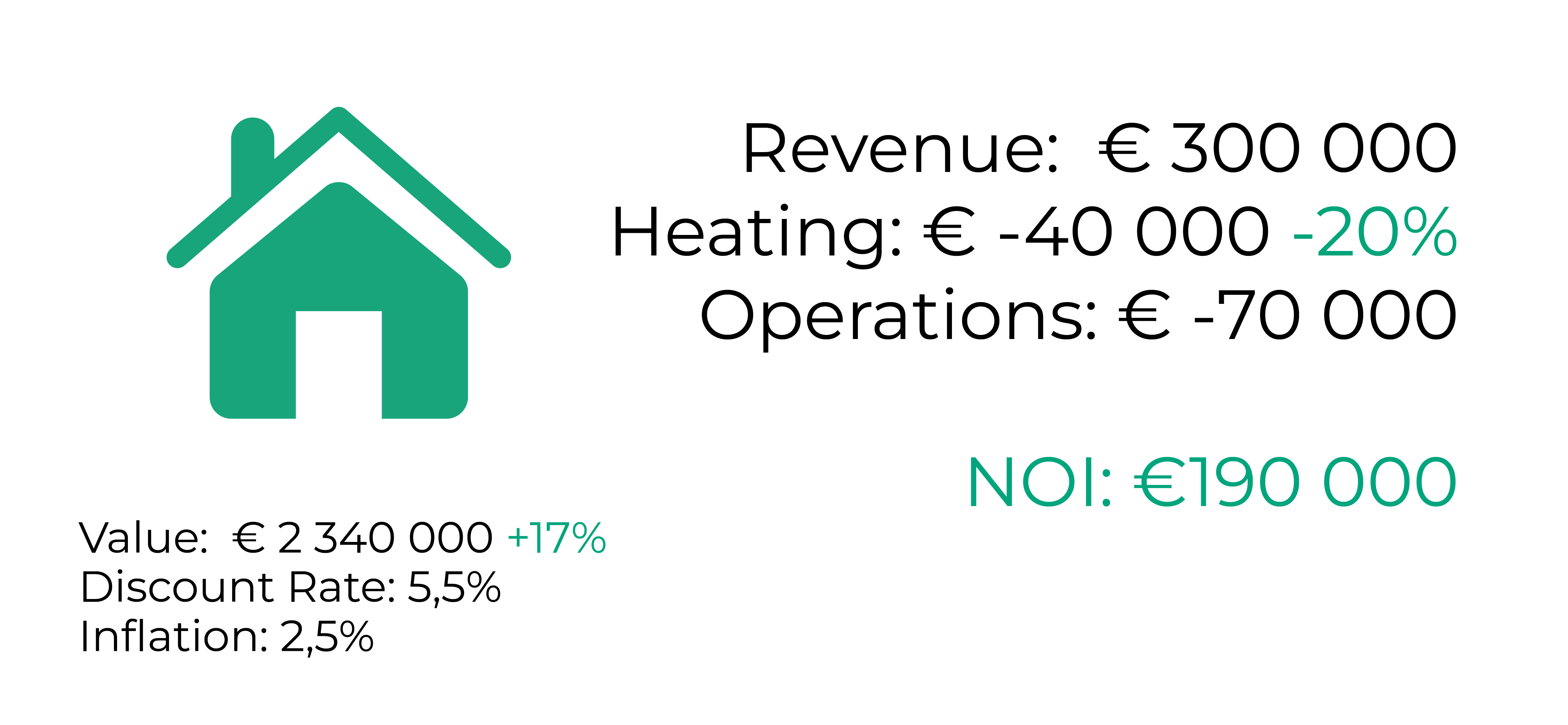 L'augmentation du RNE entraîne une hausse de la valeur de la propriété à 2 340 000 euros, ce qui correspond à une augmentation de valeur de 17 %. Le résultat final de l'investissement est à la fois une réduction des coûts opérationnels et une valeur immobilière plus élevée.